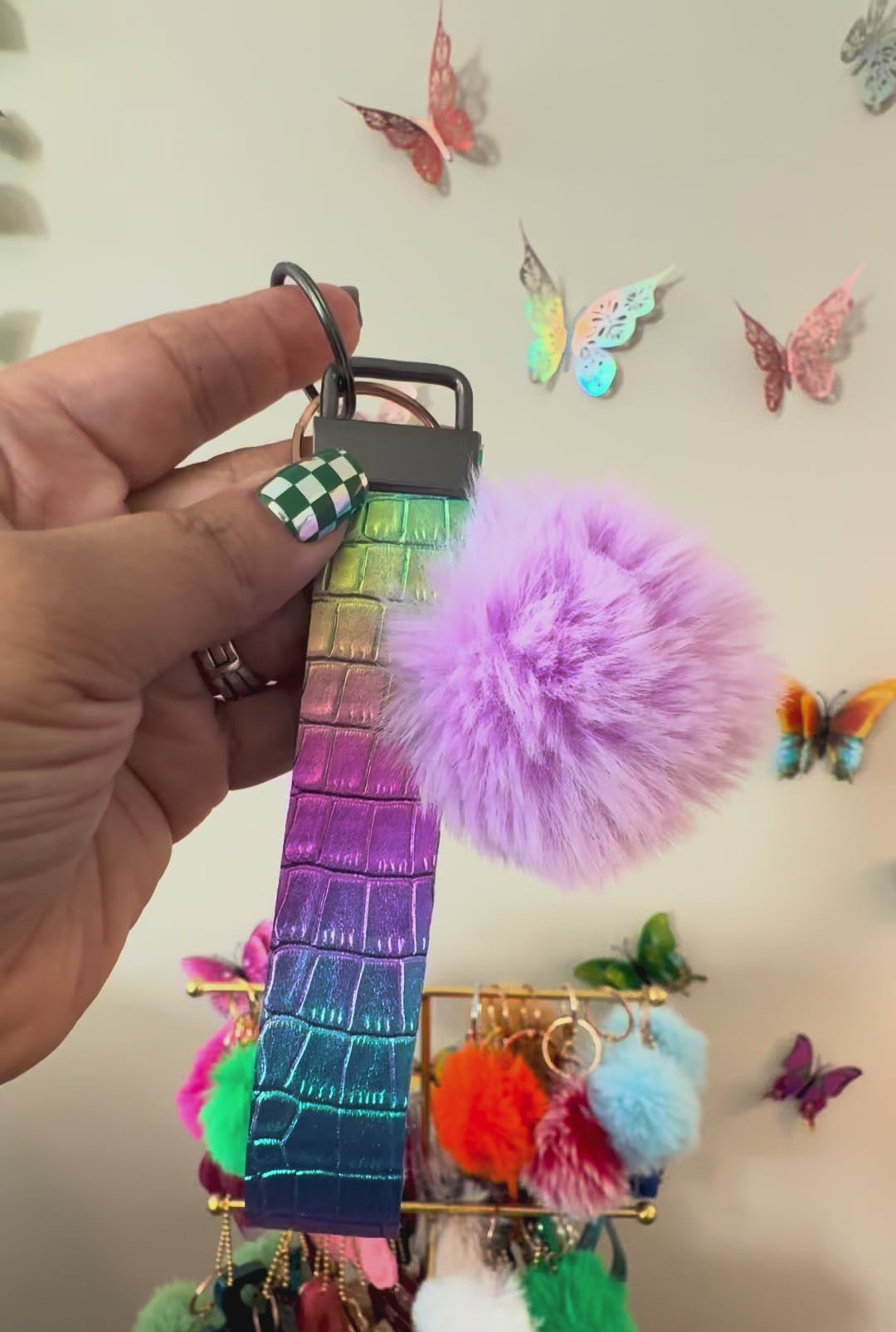 Your Keys, Only Brighter Never dig for your keys again! Our Double-Sided Colorful Wristlet is a high-visibility, high-energy accessory designed for life on the move. Featuring a vivid, multi-color pattern printed on both sides of a premium ribbon, itโs finished with a coordinating ultra-plush puff ball. Itโs the perfect "grab-and-go" piece that looks just as good around your wrist as it does hanging from your bag.